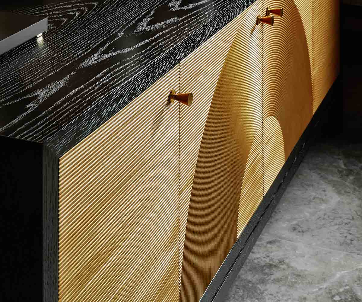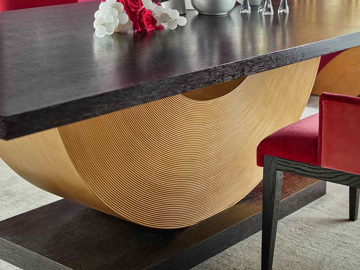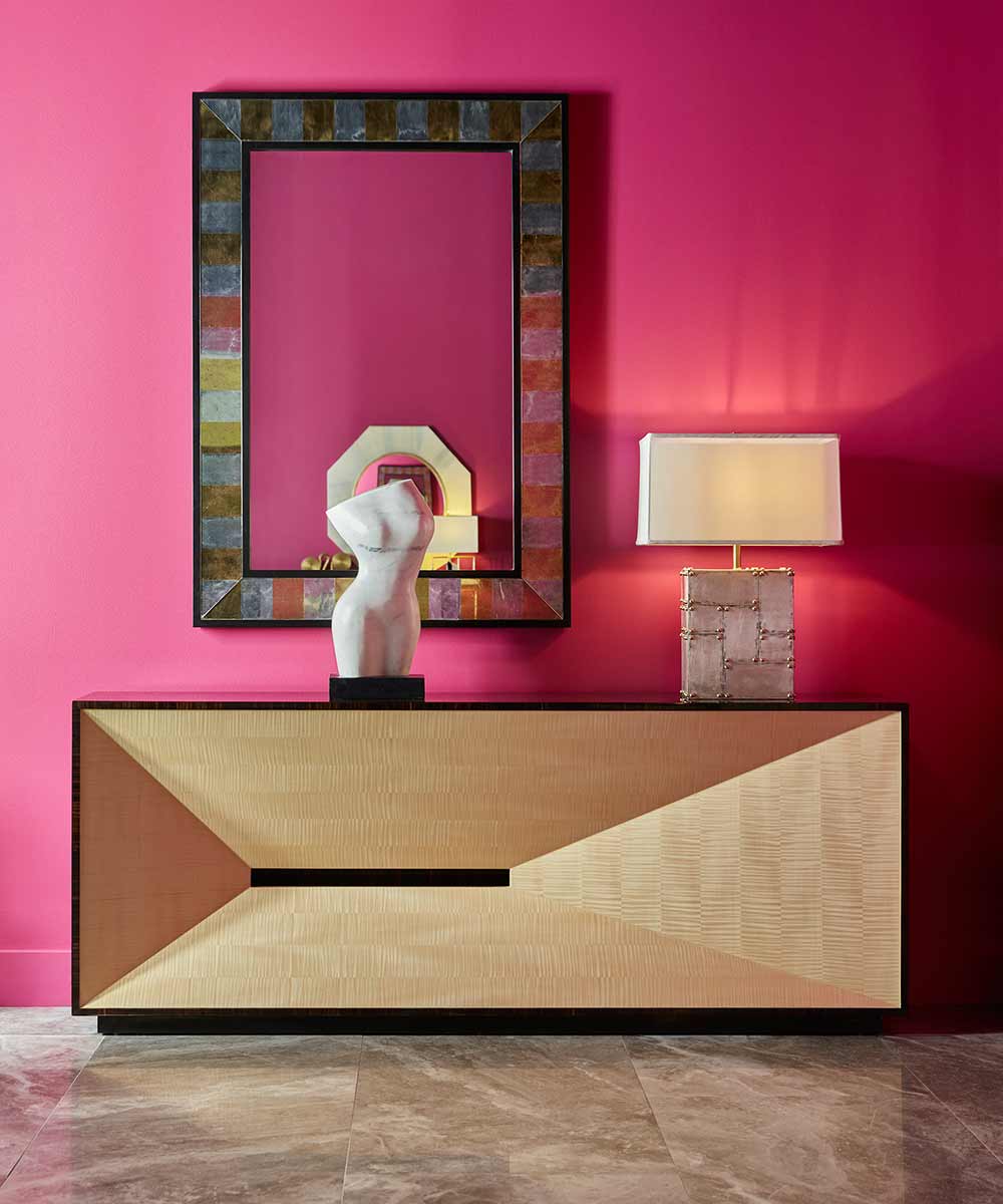 Jamie embodies modern elements true to his core design sensibilities, relevant to designers and consumers today. An eclectic juxtaposition of materials including rich mahogany, leather, hammered brass, mother of pearl, marble, and cerused finishes, provides a fresh and alluring take on contemporary style. Jamie’s expertise with textiles, patterns, colours and textures are evident in the alluring upholstery and masterful use of colour on furniture and upholstery alike.