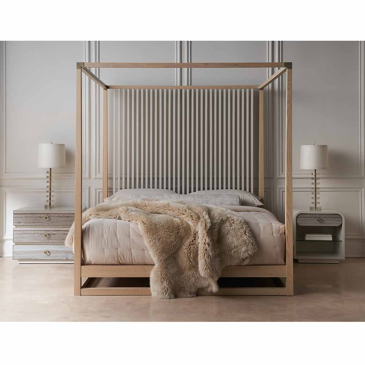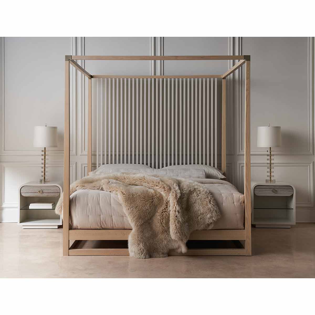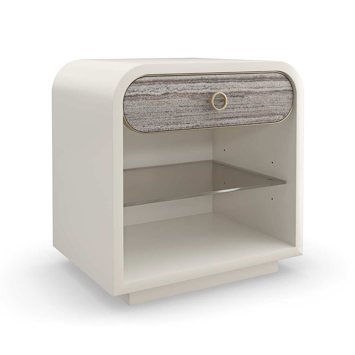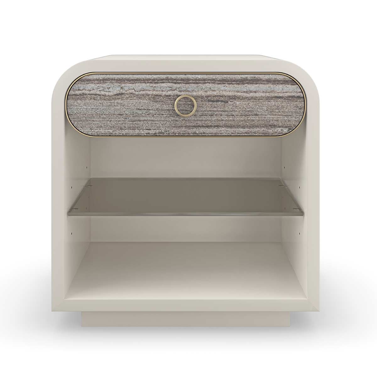 Fundamental in form and function, Quarry draws attention with its compelling mix of texture and material. Features a single drawer, crafted from polished grey sandstone framed in metal and minimally adorned by a small ring pull in Champagne Gold. Offers ample open space with a smoked bronze glass shelf for keeping night time reads and decor. An Almond Milk finish adds soft contrast in a creamy neutral hue.