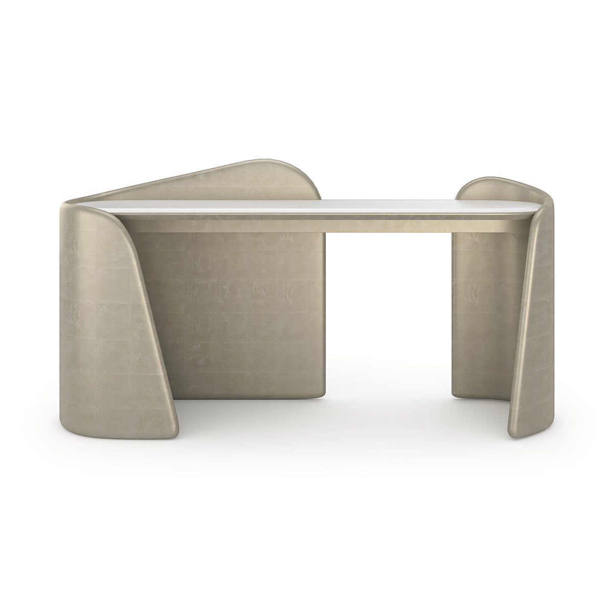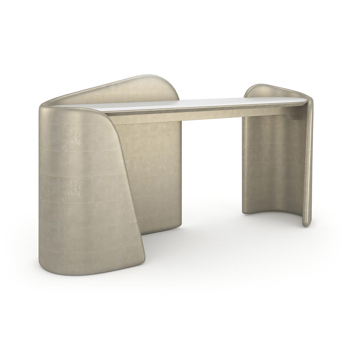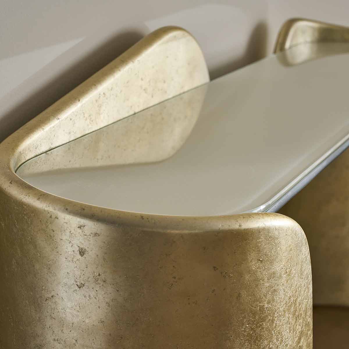 This console’s striking presence is remarkable for its two asymmetrical, undulating cuff-like bases that sweep around each end of the piece. The bases finish reflects light and are dramatically wrapped in Oracle Broken Leaf. Its oval glass top is frosted and backed in white with delicate gold flecks. This is a truly extraordinary piece for any dining room, living room, study or bedroom.