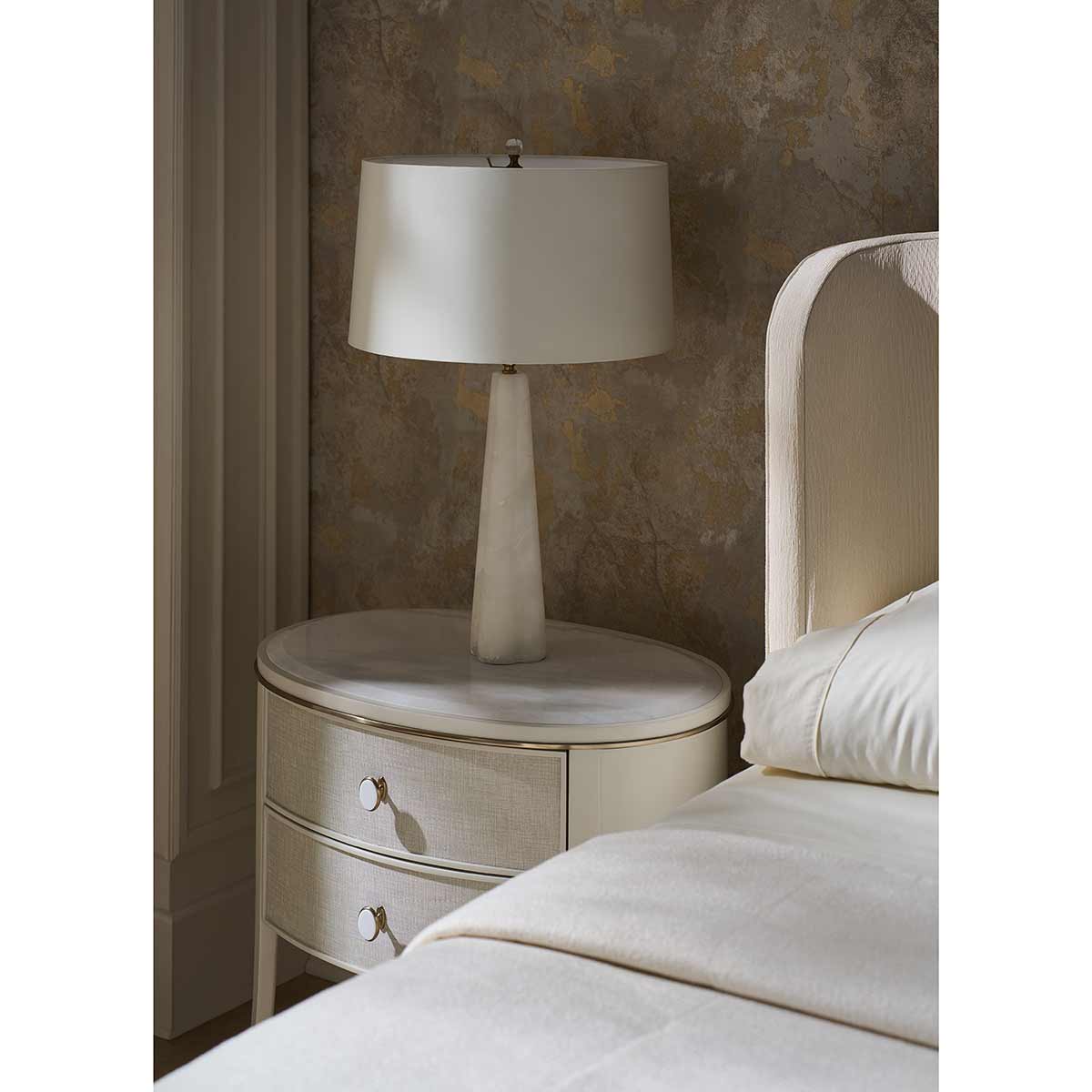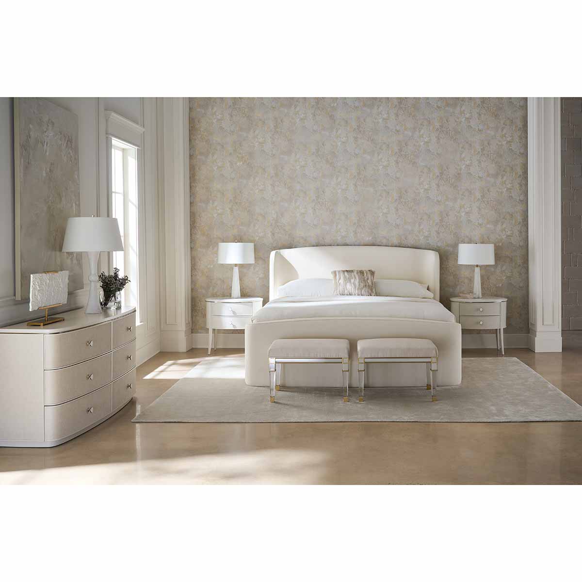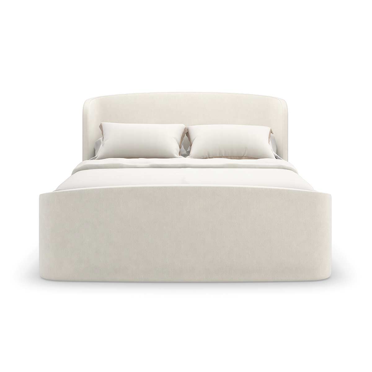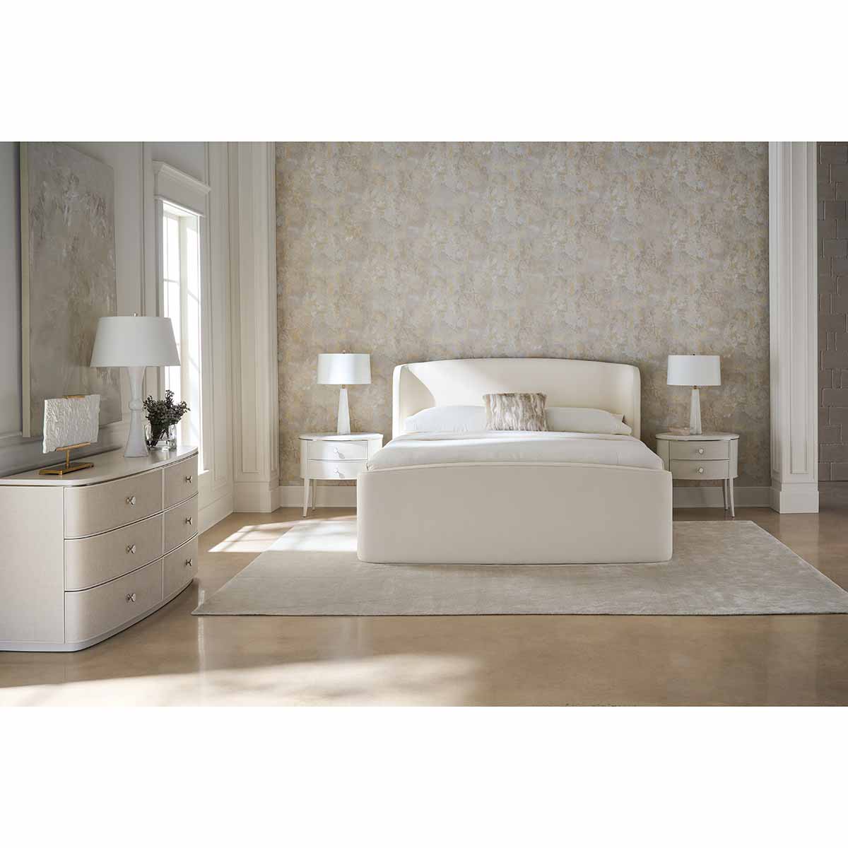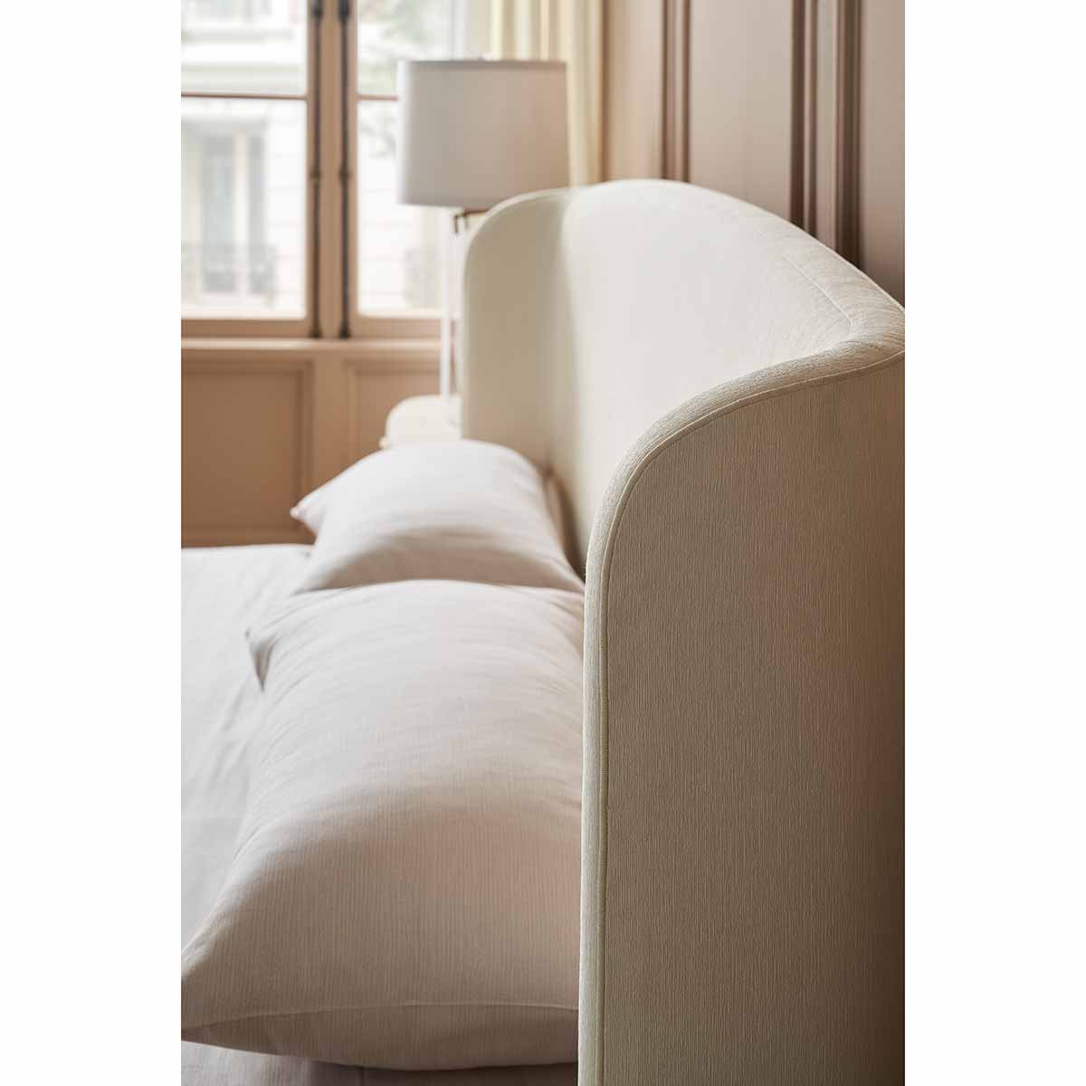 With an enveloping silhouette, the Soft Embrace bed evokes the naturally elegant form of a shell, found along the shore after eons at sea. Fully upholstered in an ivory ribbed fabric, it introduces a soothing hue and subtle texture to bedroom interiors. Its welcoming shape invites calm and pairs well with our Simply Perfect nightstand, as well as numerous other case pieces in our collection.