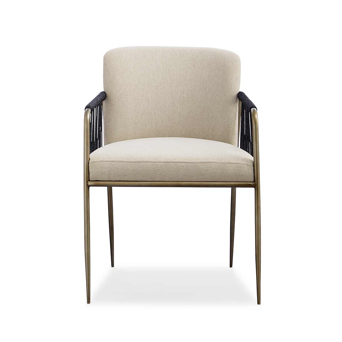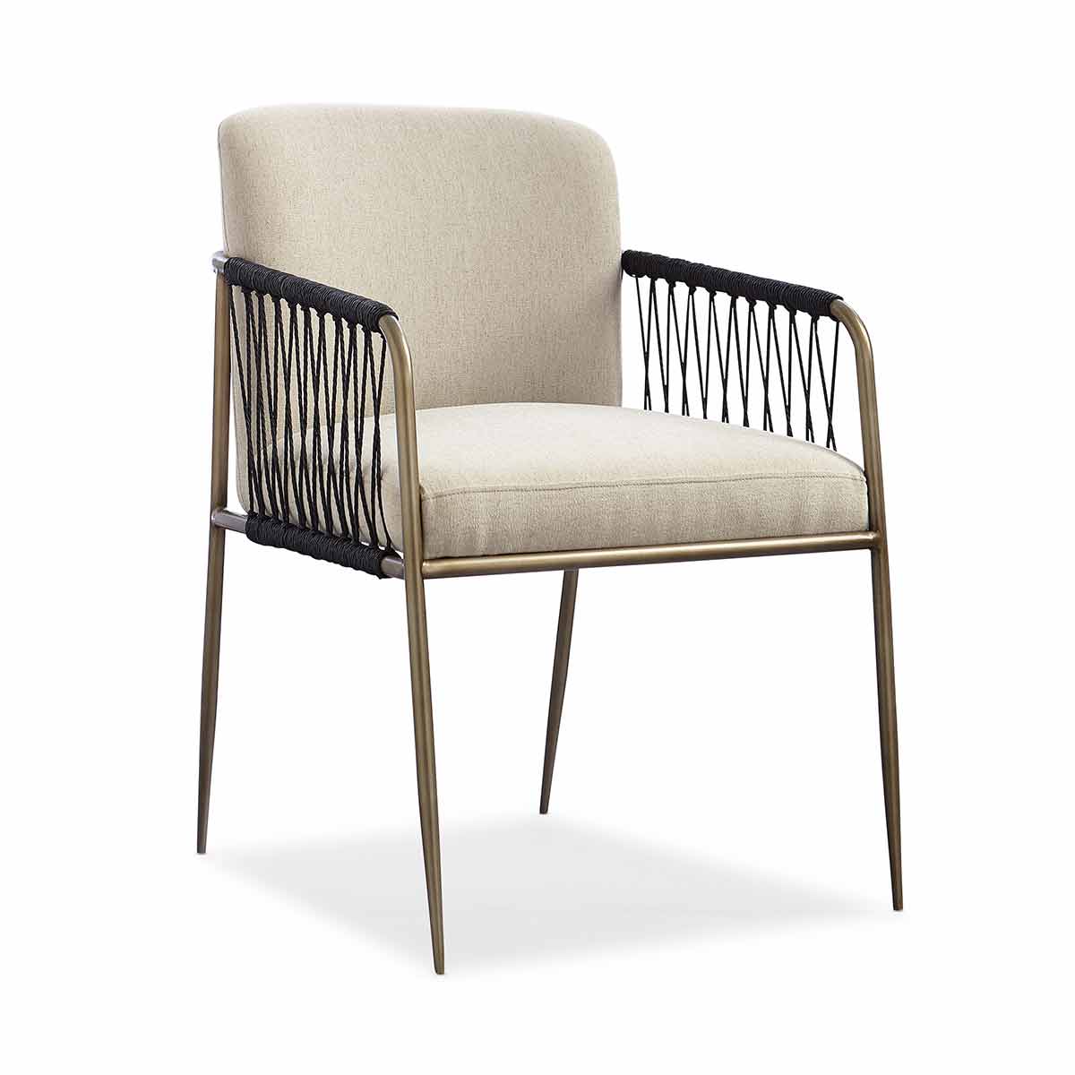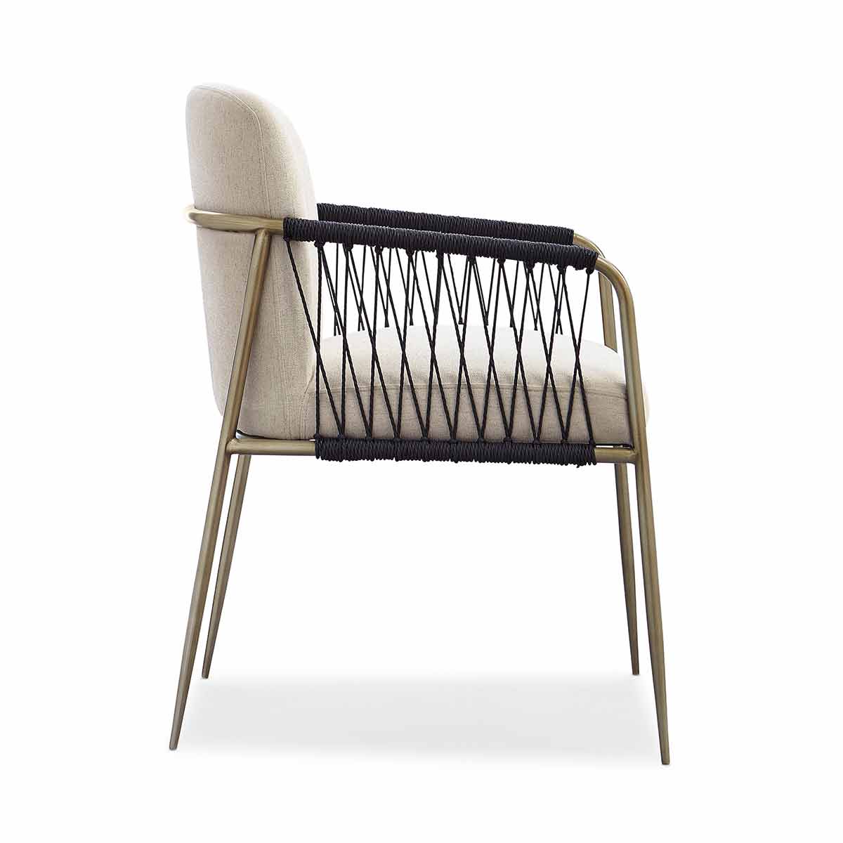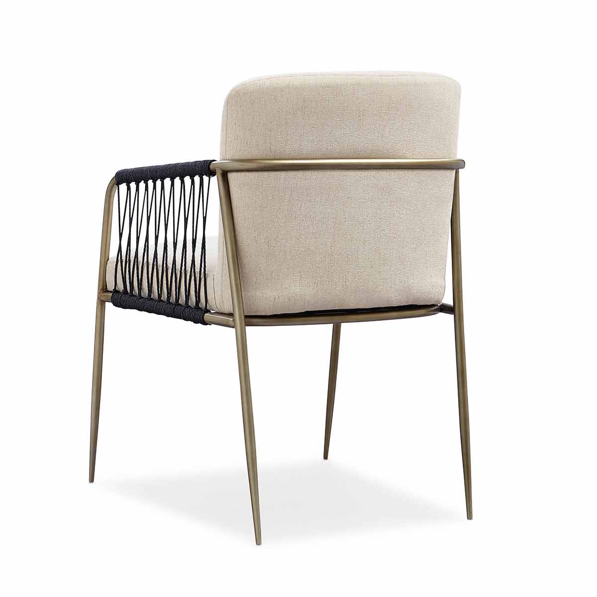 Mixing old and new, this remarkable chair is a visual expression of the best of both worlds. Its classic form is updated in luxe materials and intriguing textures to create a must have piece for today’s well dressed dining room. The chair’s metal frame wears a Bronzed Metal finish while elegantly woven black cording highlights the open space alongside each arm. An upholstered seat and seat back in an elegant neutral create a place ideally suited for hours of comfortable sitting and entertaining.