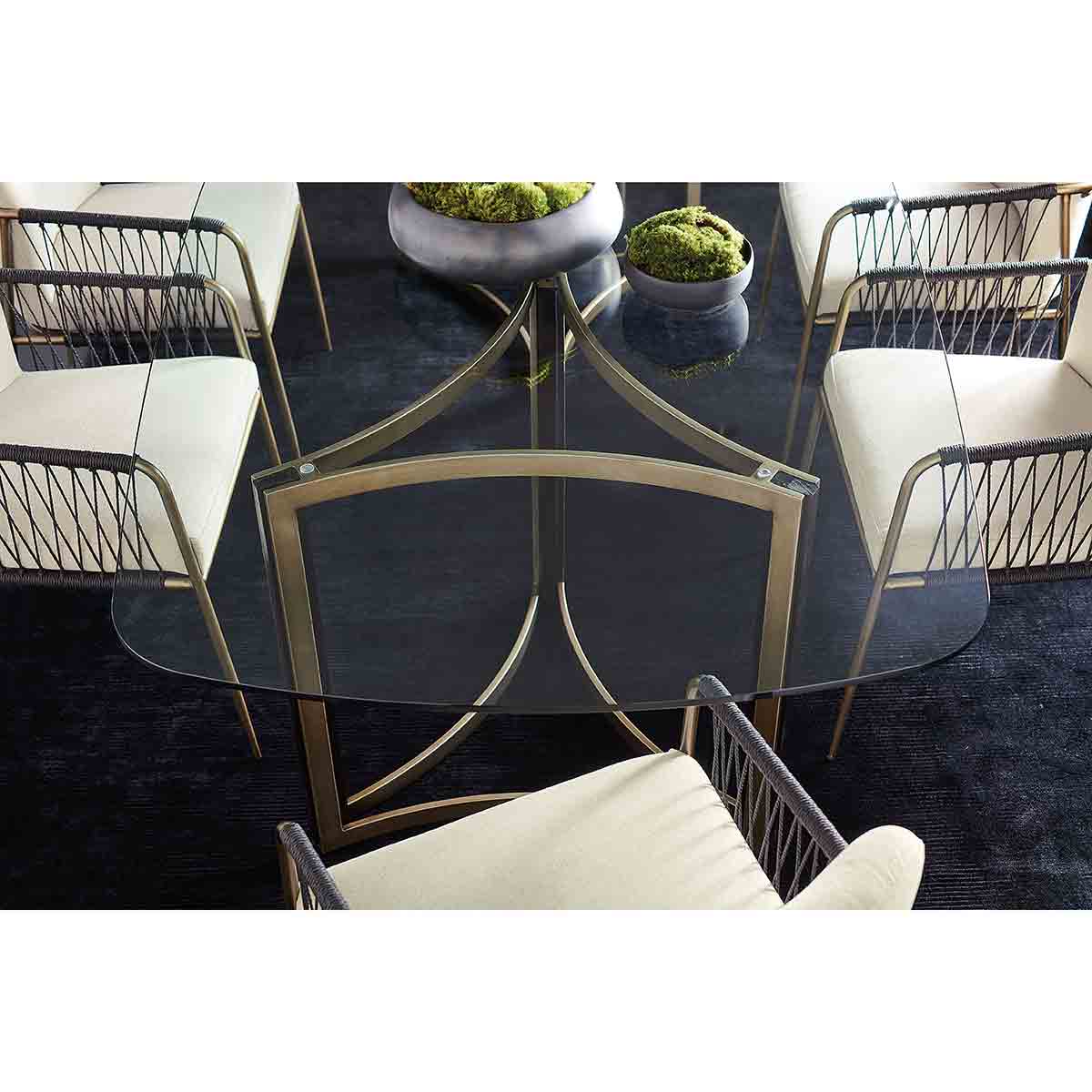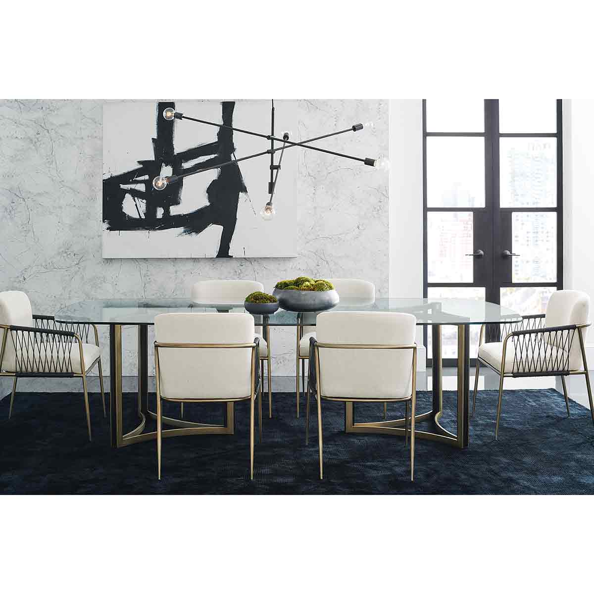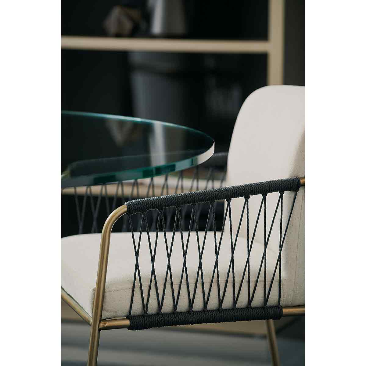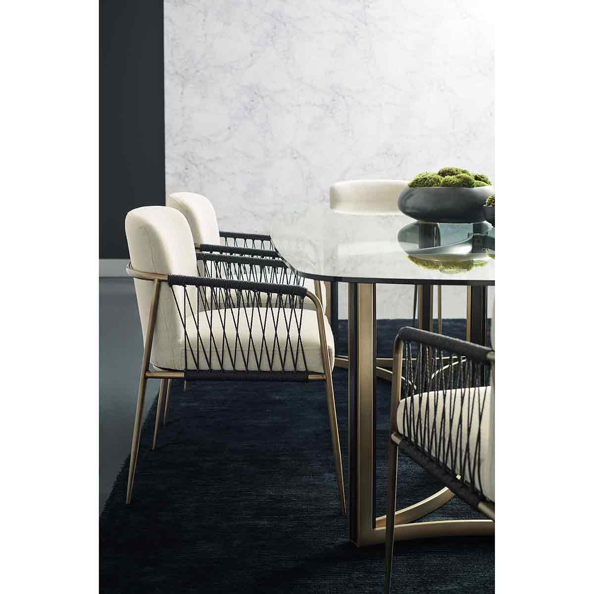 Mixing old and new, this remarkable chair is a visual expression of the best of both worlds. Its classic form is updated in luxe materials and intriguing textures to create a must have piece for today’s well dressed dining room. The chair’s metal frame wears a Bronzed Metal finish while elegantly woven black cording highlights the open space alongside each arm. An upholstered seat and seat back in an elegant neutral create a place ideally suited for hours of comfortable sitting and entertaining.