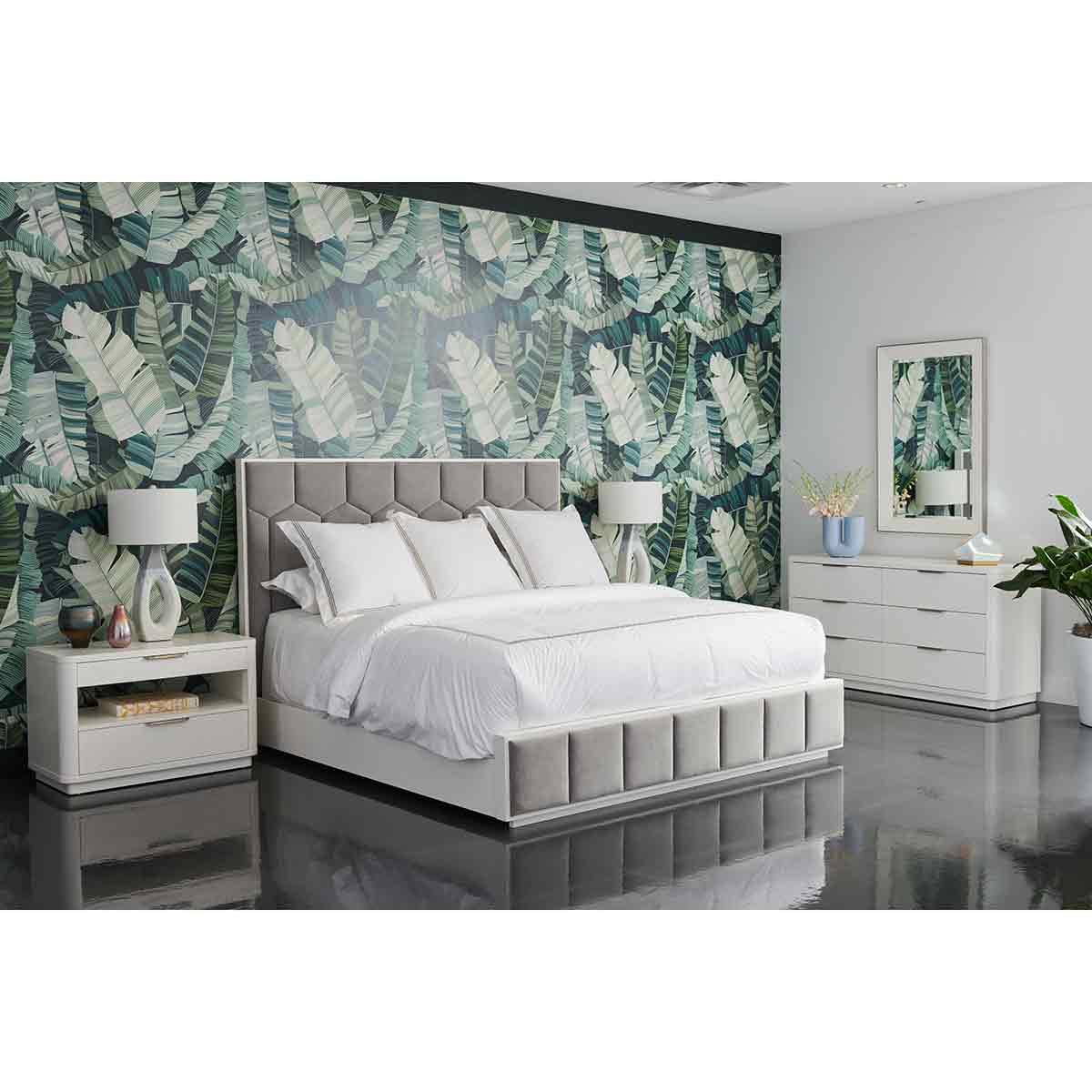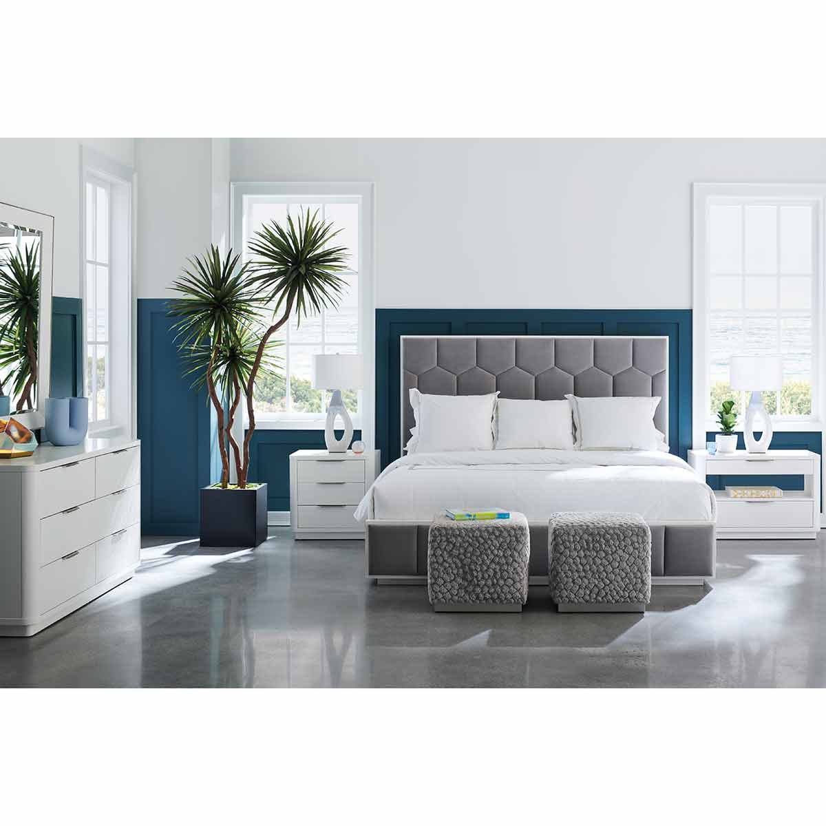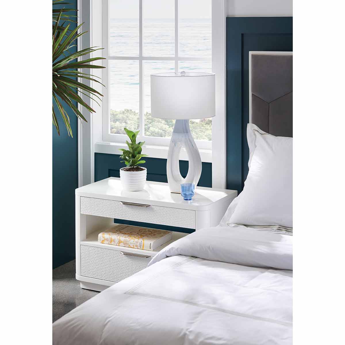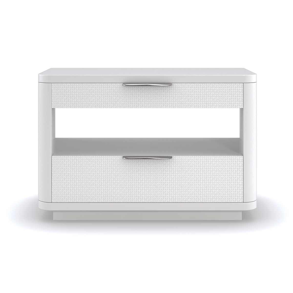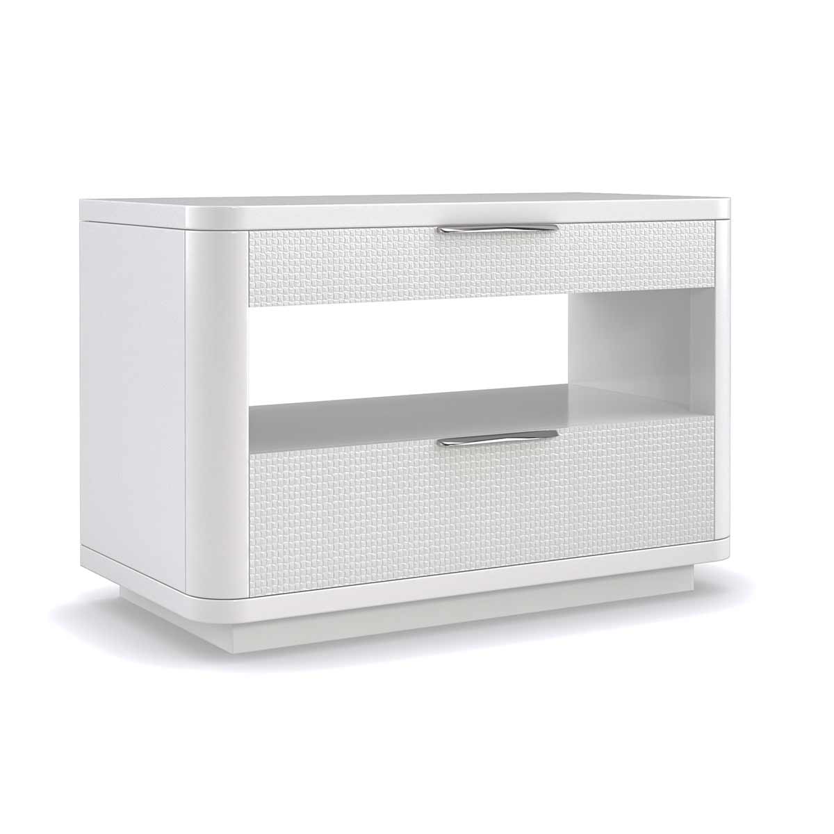 Rounded edges soften the clean lined In Touch bedside table, quietly captivating in a Cloud White finish. Carved drawer fronts add tactile appeal with a woven mini-tile motif, accentuated by finger-cup pulls in Satin Nickel. Features two drawers and open centre storage with a built-in light. A USB port and cutouts in the back let you charge devices and keep cords out of sight.