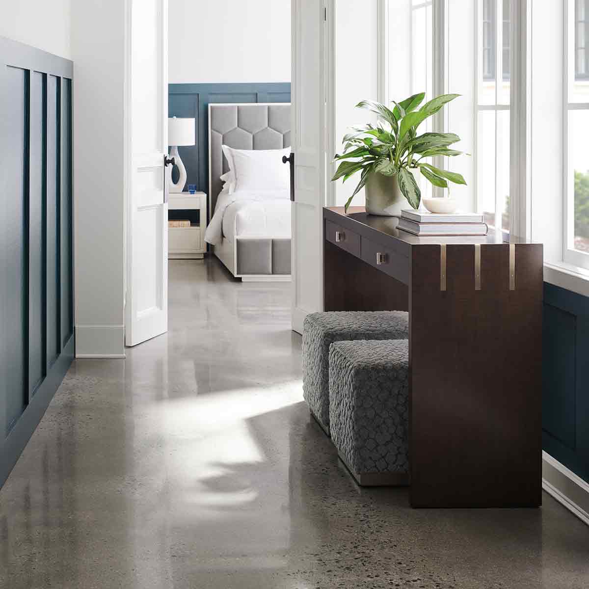 • Two drawers with fronts in woven resin motif pattern. Top drawer with soft close side guides and bottom drawer with soft close undermount guides.