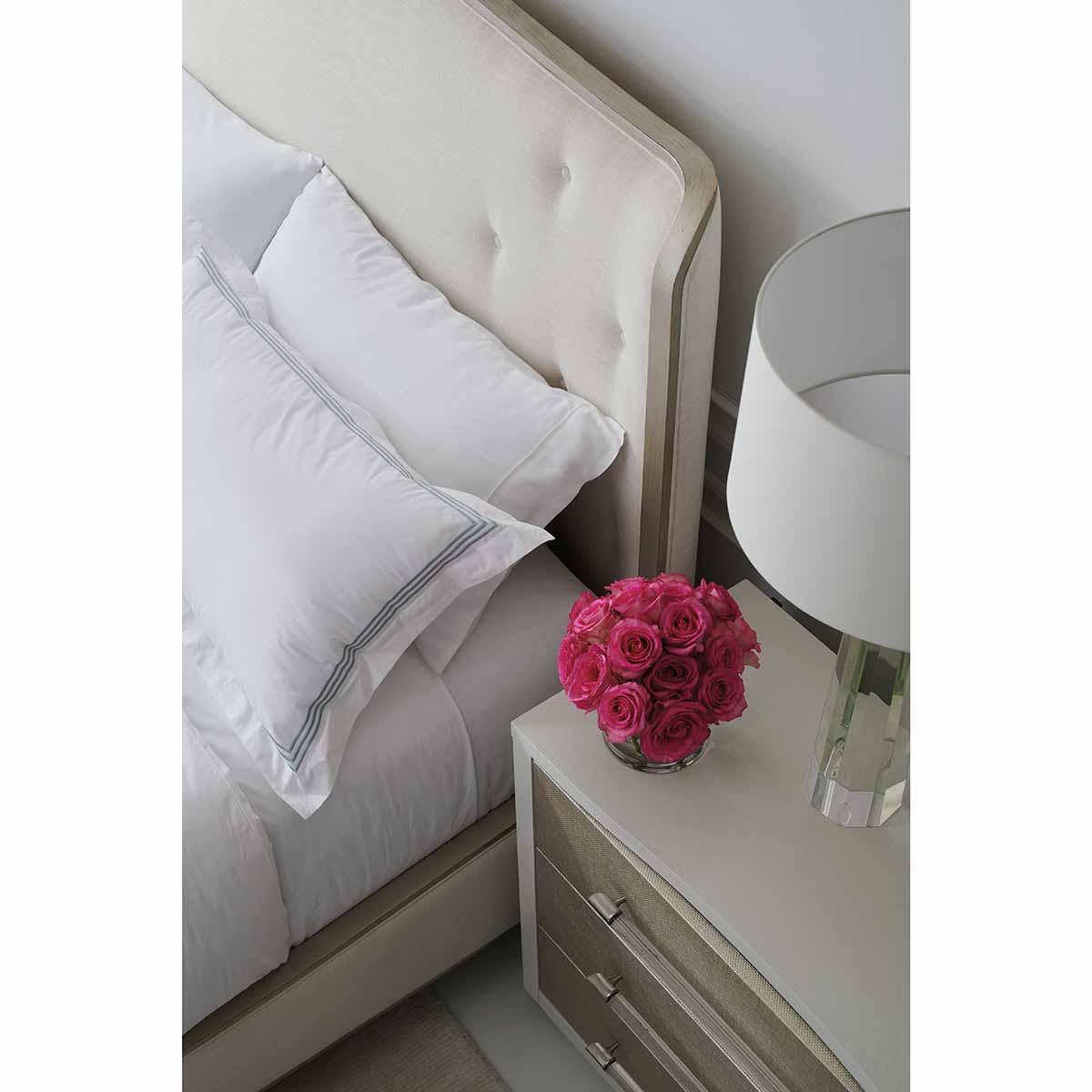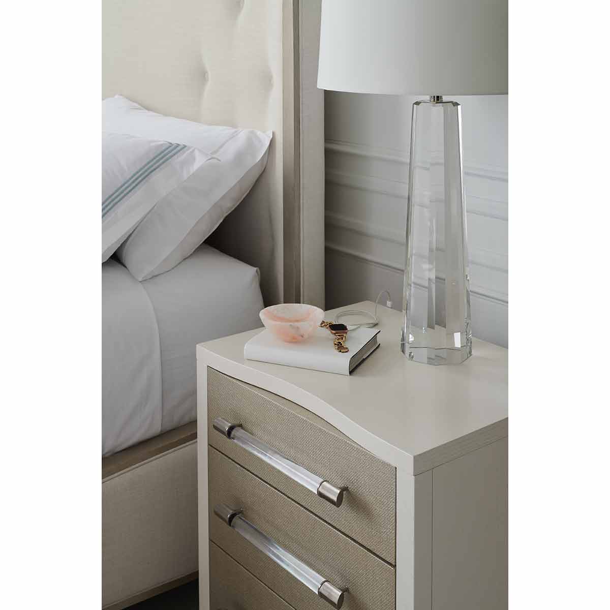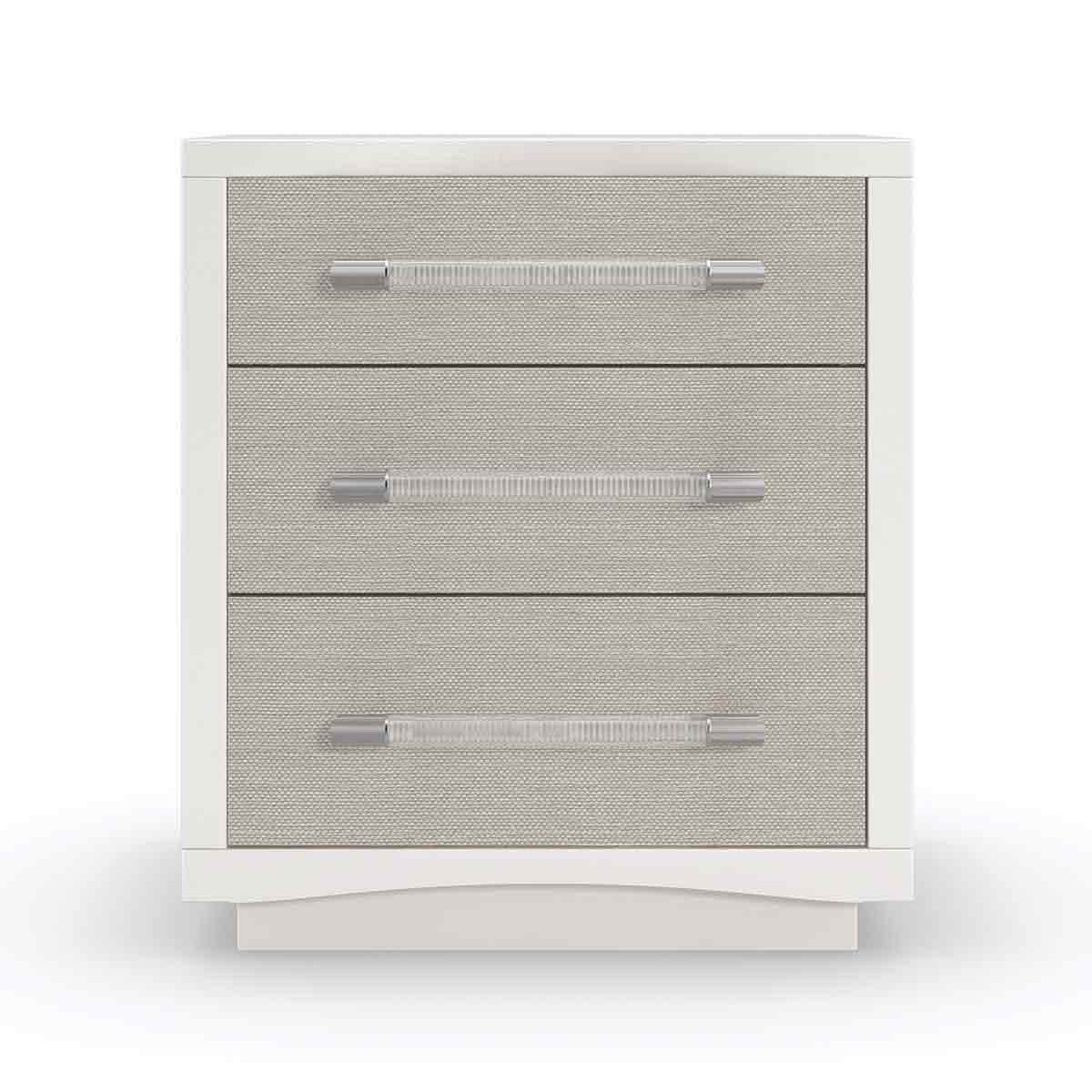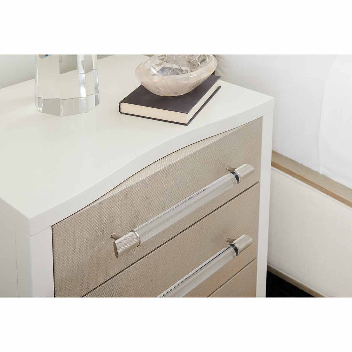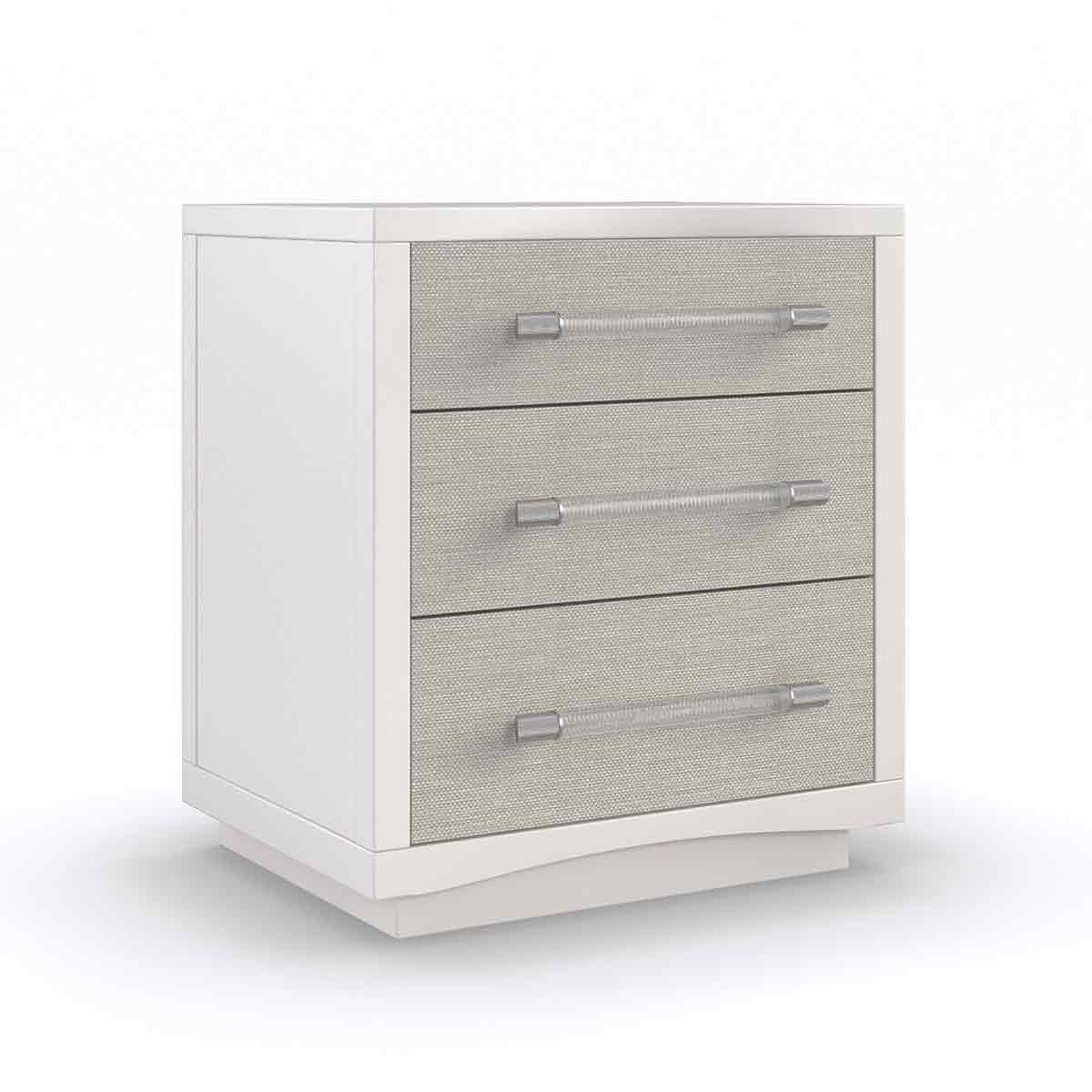The elegant Clarity bedside table introduces a softly textured, metallic element with inherent organic character. Woven raffia drawer fronts are re-imagined in Sun-kissed Silver, complemented by ash veneers in a Pearly White finish. For a distinctive finishing touch: clear acrylic drawer handles are capped in ribbed stainless steel. Features a USB port on the back for convenient charging and cutouts for wire management.