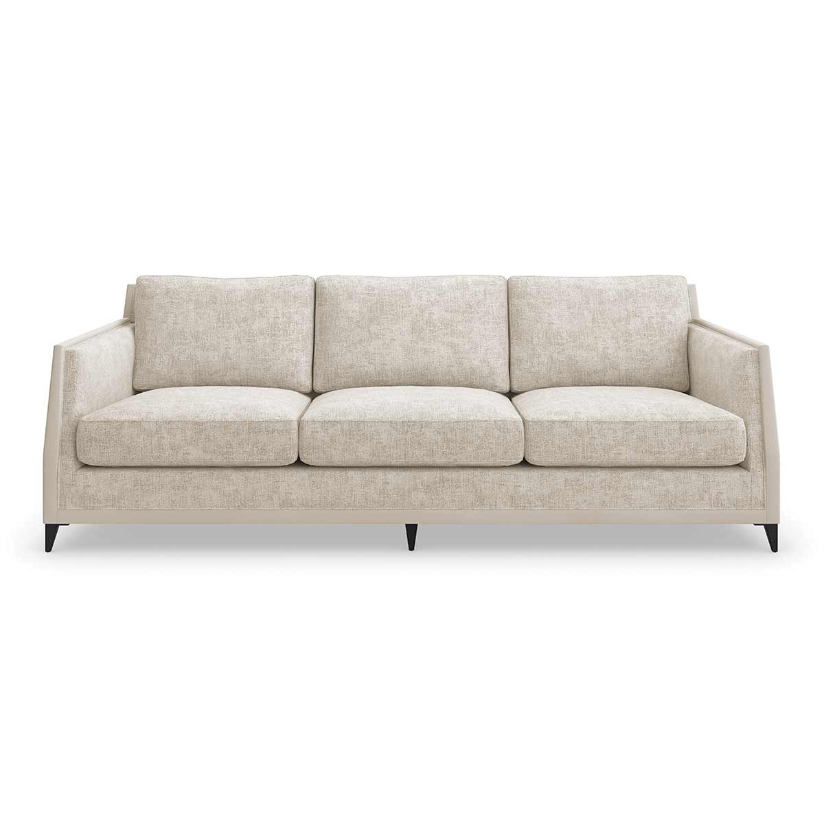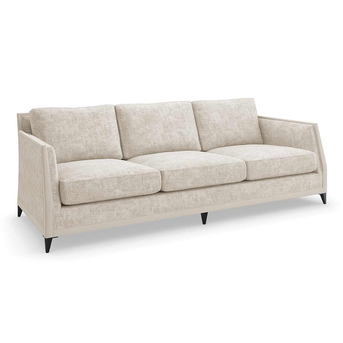 A classic silhouette with Art Deco influences, the versatile Limitless Sofa introduces a crisply tailored yet beautifully worn aesthetic in a distressed chenille fabric. Accentuating subtly angles and a sophisticated profile, a micro suede border lends tonal contrast and texture, warmly complemented by tapered feet in a Brushed Deep Bronze metal.